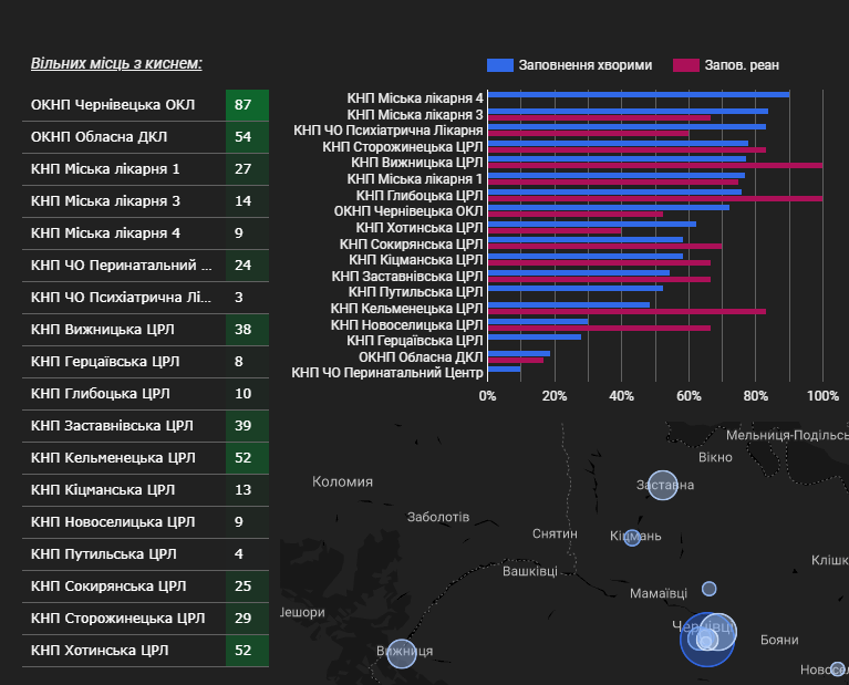 Скільки є лікарняних місць і скільки з них забезпечені киснем – детальний опис на дашборді Чернівецької області, інформує Чернівецька ОДА.