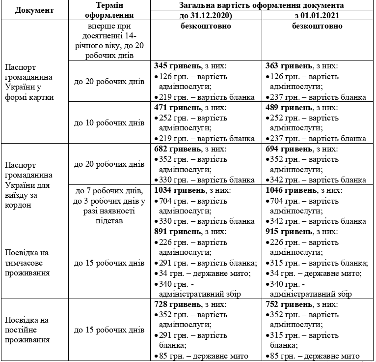 Громадяни України, іноземці та особи без громадянства, які здійснили оплату адміністративних послуг та подали заяви для оформлення документів до 31.12.2020, отримають документи за старою ціною.