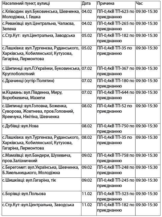 Як інформує "Чернівціобленерго", вимкнення відбуваються через роботи з капітального та поточного ремонту або приєднання електрообладнання. Виконання цих робіт неможливе без знеструмлення мереж. Час вимкнення залежить від тривалості виконання робіт.
