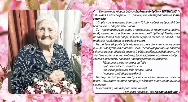 101 рік — це низка історичних подій, понад 100 років — це довгий і тернистий життєвий шлях із злетами та падіннями, 101 рік — це море сліз радості та горя, 101 рік — це мільйони хвилин розчарувань і віри у краще майбутнє, понад 100 років – це ціла епоха, ім’я якої — Людмила Андріївна Зеленська! Так пишуть про ювілярку її люблячі родичі.
